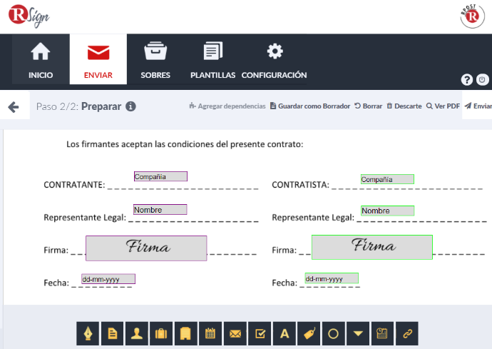 Con una interfaz intuitiva, RSign te permite preparar documentos para que múltiples destinatarios los completen y firmen. RSign puede utilizar campos preconfigurados como nombre, fecha, dirección, firma, entre otros, simplificando el proceso de firma.